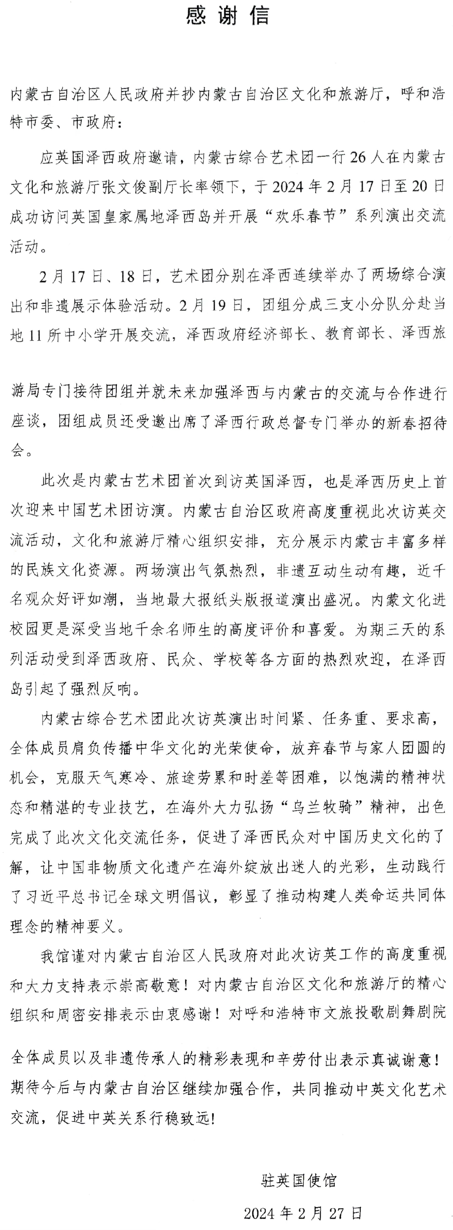 3月初收到驻英国使馆感谢信,信中提到,此次内蒙古综合艺术团是英国泽西岛历史上首次迎来的中国艺术团,两场演出活动好评如潮,在当地最大报纸头条报道。内蒙古文化进校园更深受当地千余名师生的高度评价和喜爱。出访团在访英演出时间紧、任务重、要求高,全体演职人员肩负传播中华文化的光荣使命,以饱满的精神状态和精湛的专业技艺,在海外大力弘扬“乌兰牧骑”精神,出色完成各项文化交流任务,生动践行了习近平总书记全球文明倡议,彰显了推动构建人类命运共同体理念的精神要义。